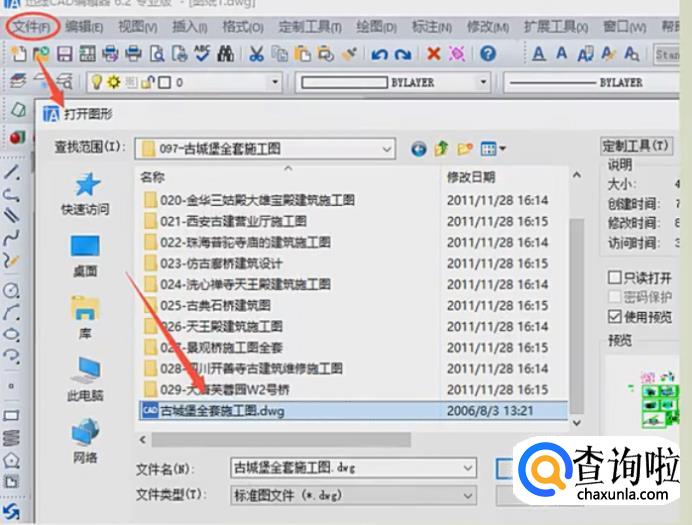点击该软件上方菜单栏中的文件选项,之后再点击”打开“属性按钮,在弹出的”打开图形“对话框中打开需要使用的CAD图纸文件就可以了。