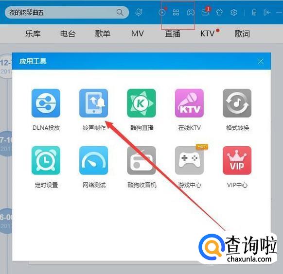 打开酷狗应用,在右上角菜单栏中找到应用工具快捷键,点开找到铃声制作: