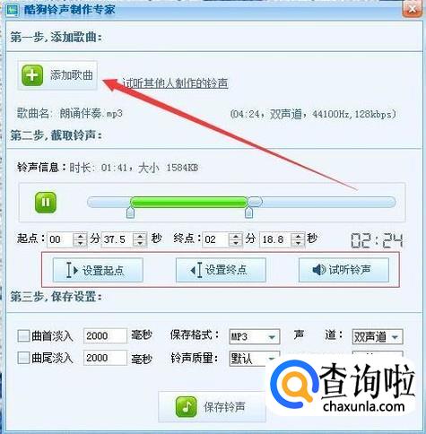 点击添加歌曲,将喜欢的音乐上传,然后设置起点和终点,设置完成后可以点击试听铃声,满意后点击保存铃声。