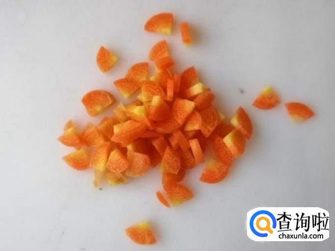 取一根胡萝卜,用清水把胡萝卜洗净,去掉两头,然后放在菜板上,把胡萝卜切成丁,切好待用。