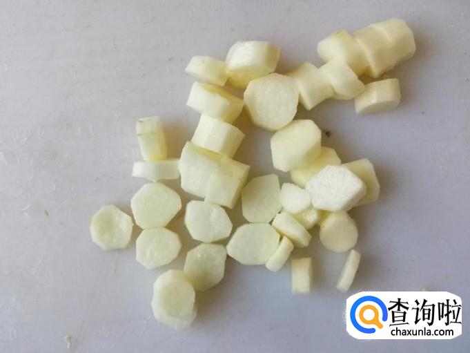 选小细山药一根,用清水把山药洗净,用刮刀去皮,然后把山药放在菜板上,切成小丁待用。