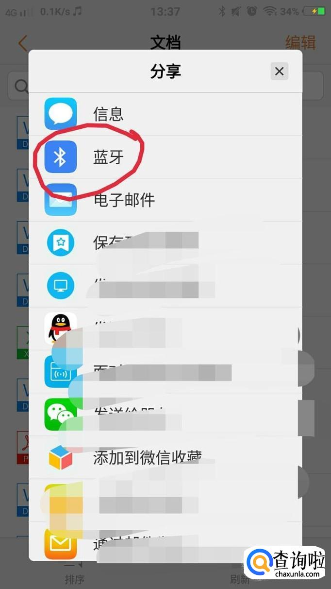 然后在分享页面点击传送方式为【蓝牙】, 然后在蓝牙界面选择刚刚配对的蓝牙设备,点击传送就OK啦。如图
