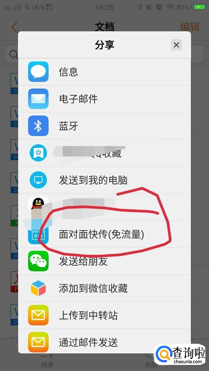 然后在分享页面中选择分享方式【面对面快传(免流量)】,然后选择分享方式为QQ,并登录QQ,如图