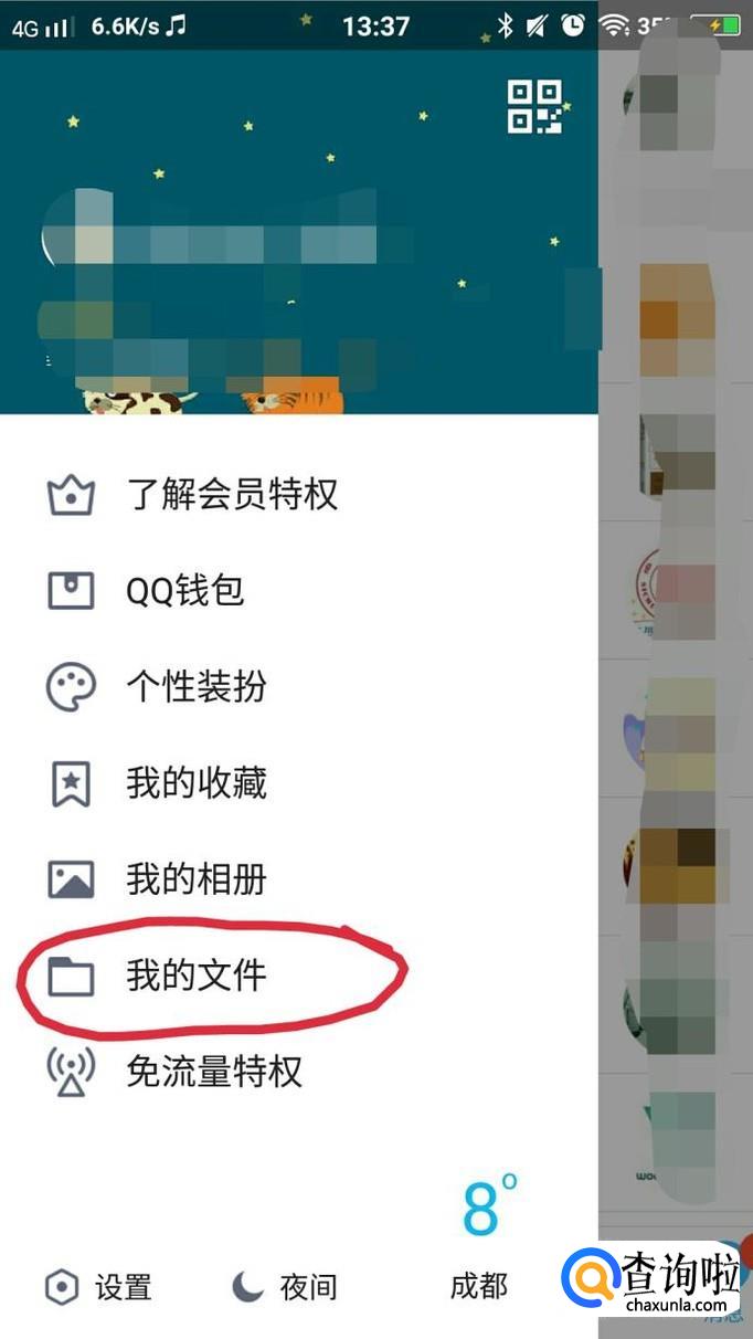使用手机QQ【面对面快传(免流量)】功能来传送文件。首先打开登录QQ,在QQ页面向右滑动屏幕,会出现以下页面,在此页面中选择点击【我的文件】,如图