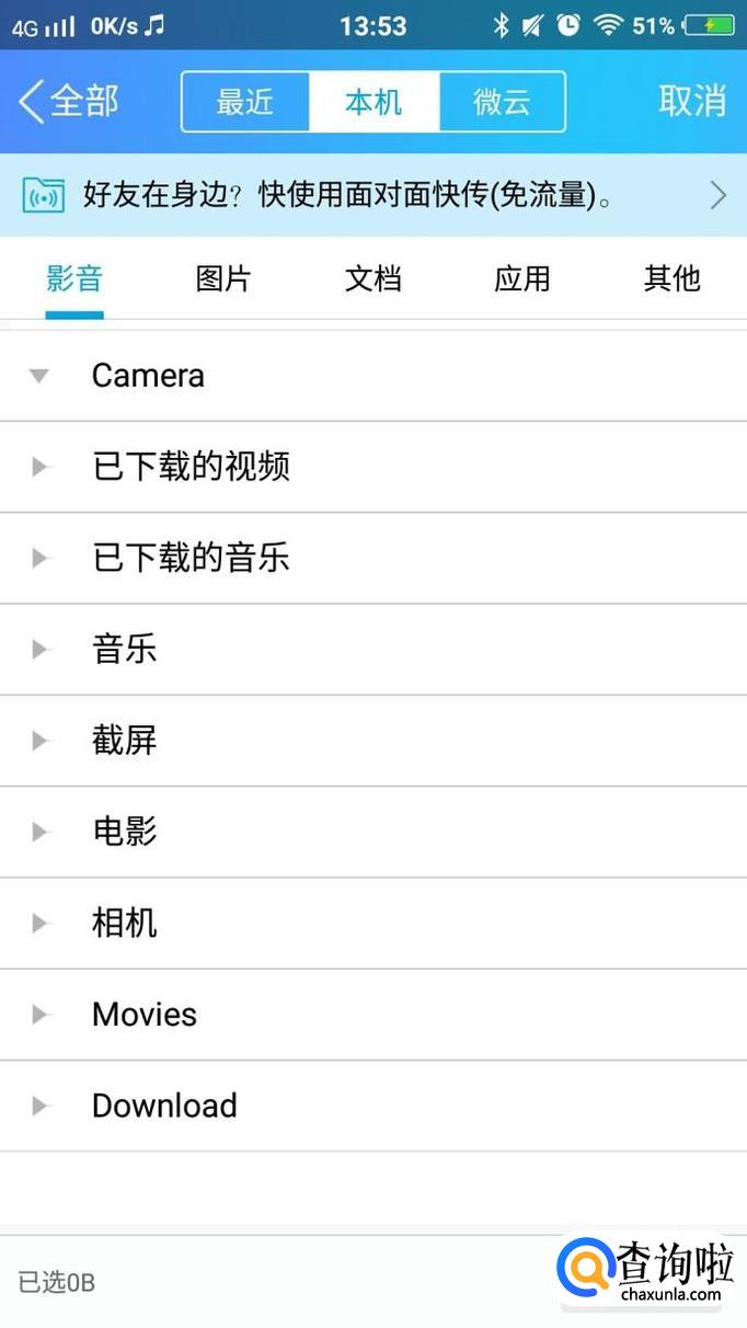 然后在本机文件中选择你要传输的文件(可以传送影音,图片,文档,应用和其它)并发送就好了。如图