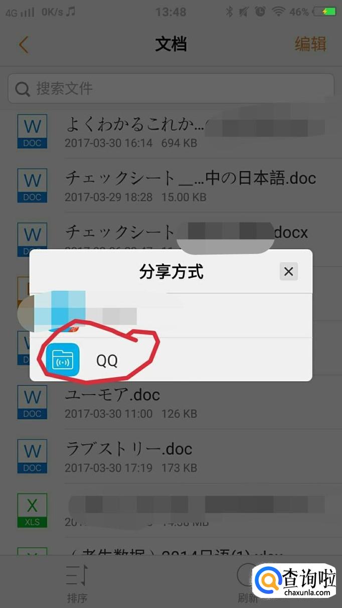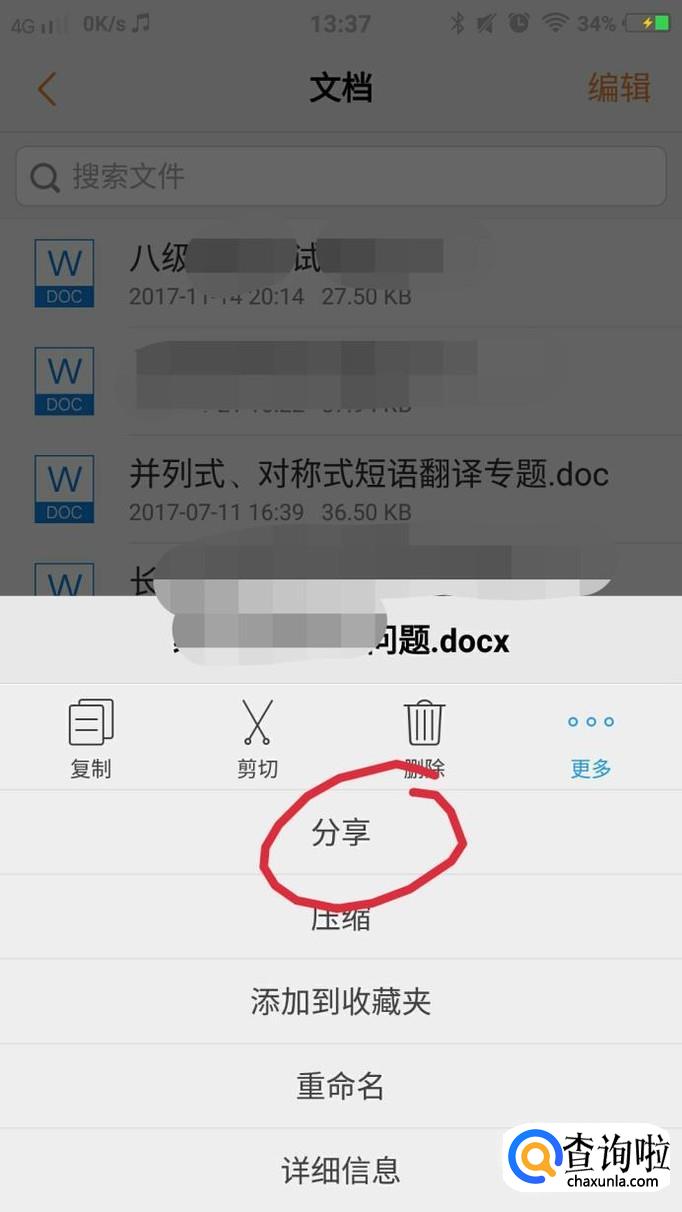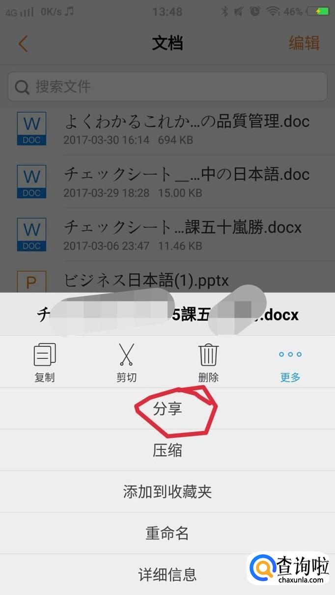 还可以点开【文件管理】(更刚才前面步骤相同),在文件管理中找到自己想要传送的文件,并长按,然后点击右下角的【更多】,在更多页面中点击【分享】,如图
