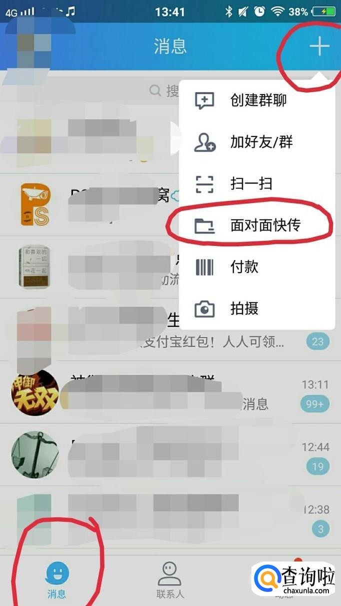 面对面快传还可以在QQ的消息页面的右上角点击【+】的符号,在跳出的页面中选择面对面快传(免流量)。如图