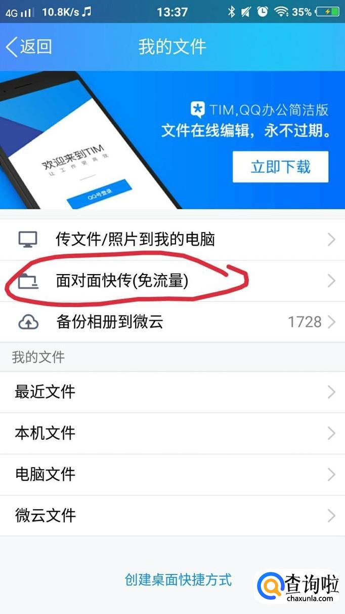 然后在我的文件页面选择点击【面对面快传(免流量)】,如图