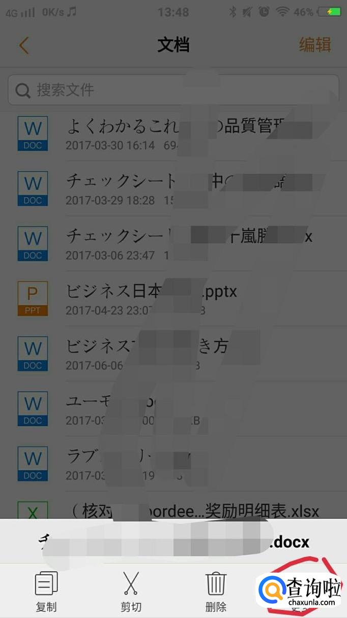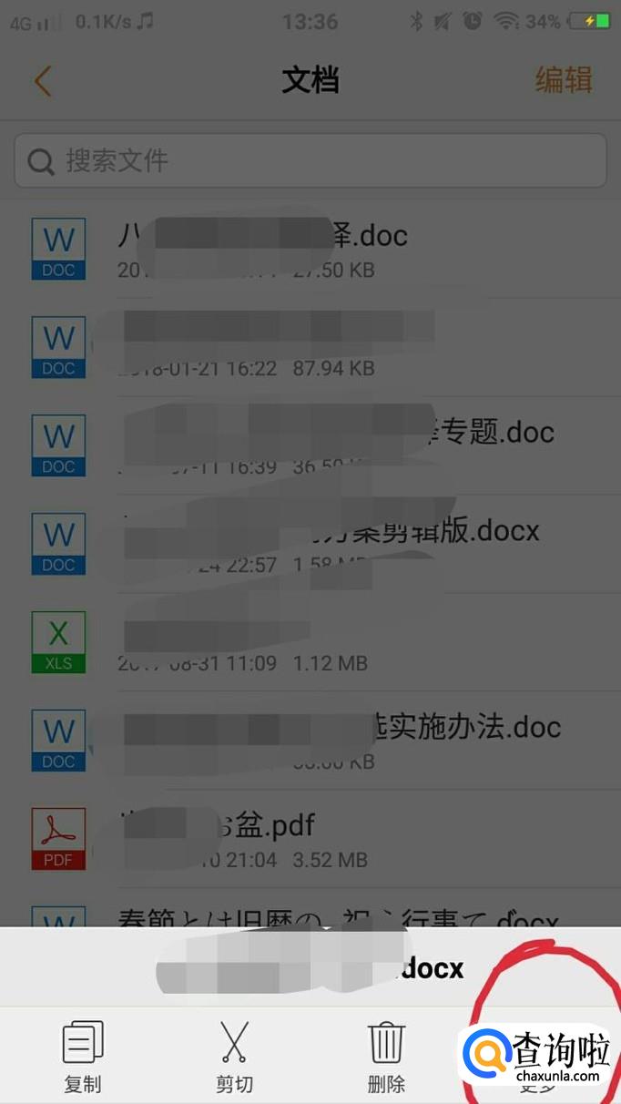 然后在文件管理中找到自己要传送的文件,并长按,然后在跳出的页面的右下角点击【更多】,如图