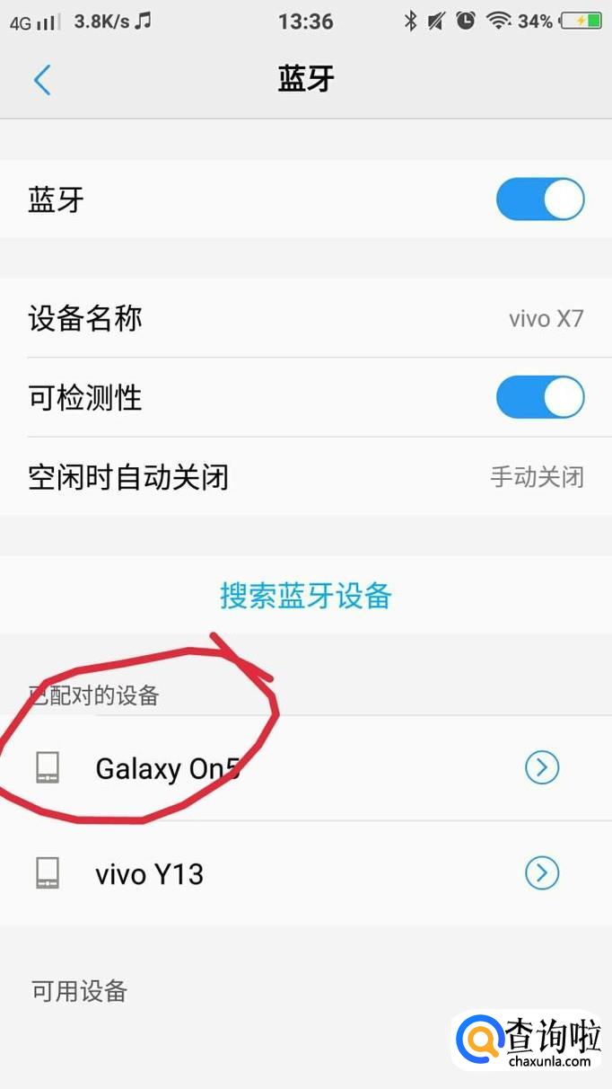 然后打开蓝牙开关,与对方手机进行配对,(需对方也开启蓝牙进行配对),如图