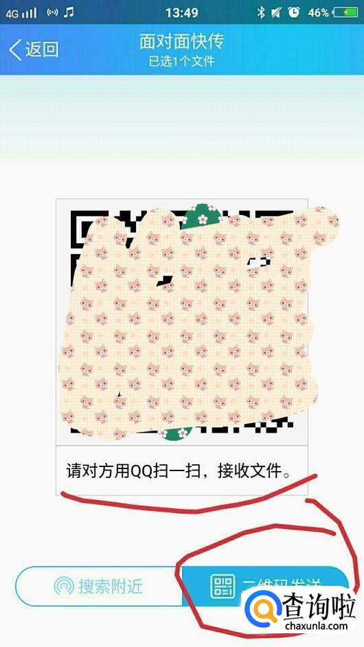 然后就可以发送文件了,(请对方打开快传接收文件)。还可以选择通过二维码发送文件,让对方打开QQ的扫一扫功能,就能接收文件啦。如图