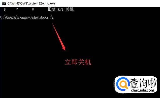 然后根据使用帮助我们可以直接输入shutdown /s命令强制关机,如下图所示