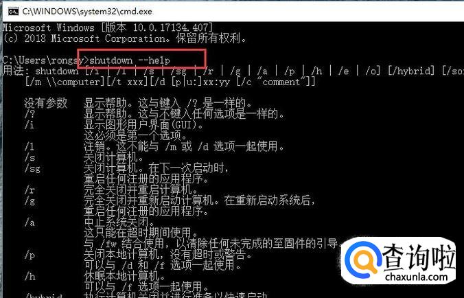接下来在弹出的CMD界面中输入shutdown --help命令来获得此命令的使用帮助,如下图所示
