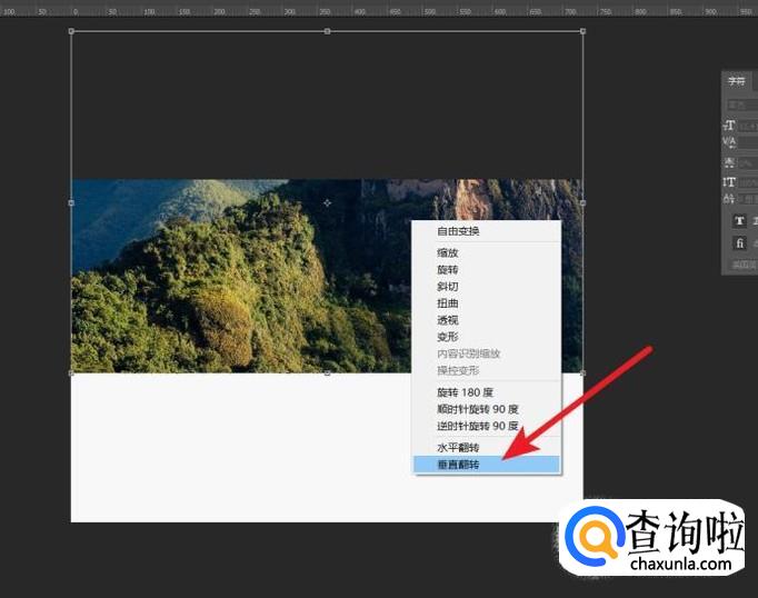 Ctrl+J复制一个图片图层,然后使用Ctrl+T,打开右键菜单,选择垂直翻转。