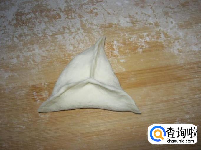 再来准备做糖三角了,用一个勺子取适量馅放入面皮中,用手挤成一个三角形。同样的方法,把所有的面皮和馅做完,然后放置15分钟左右。