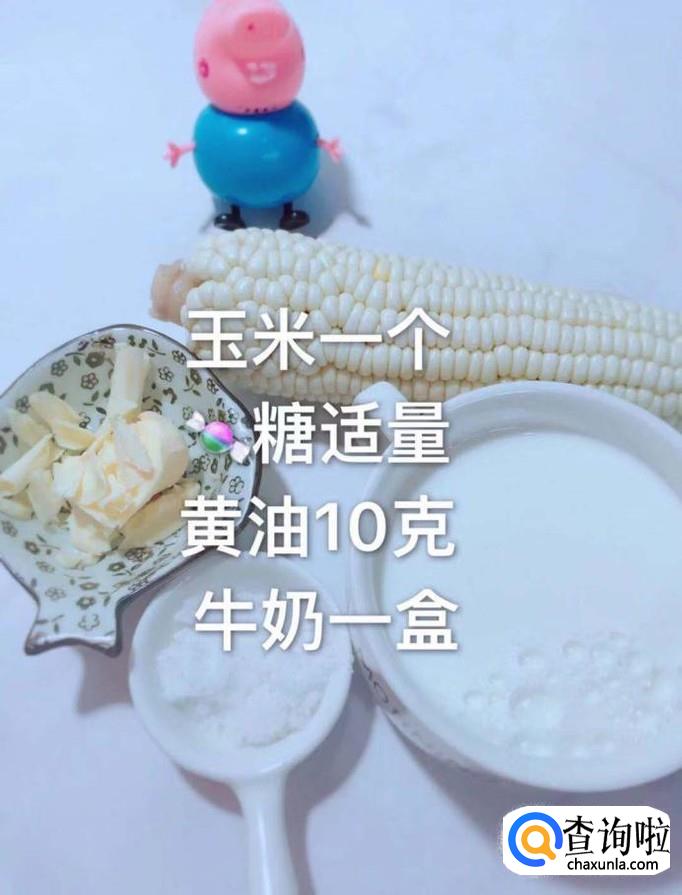 首先准备好我们要用到的所有食材,如下图所示。小贴士:玉米一个,糖适量,黄油十克,牛奶一盒。