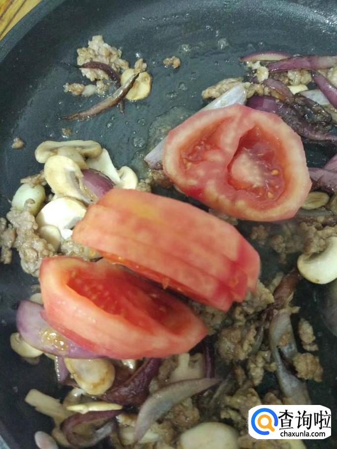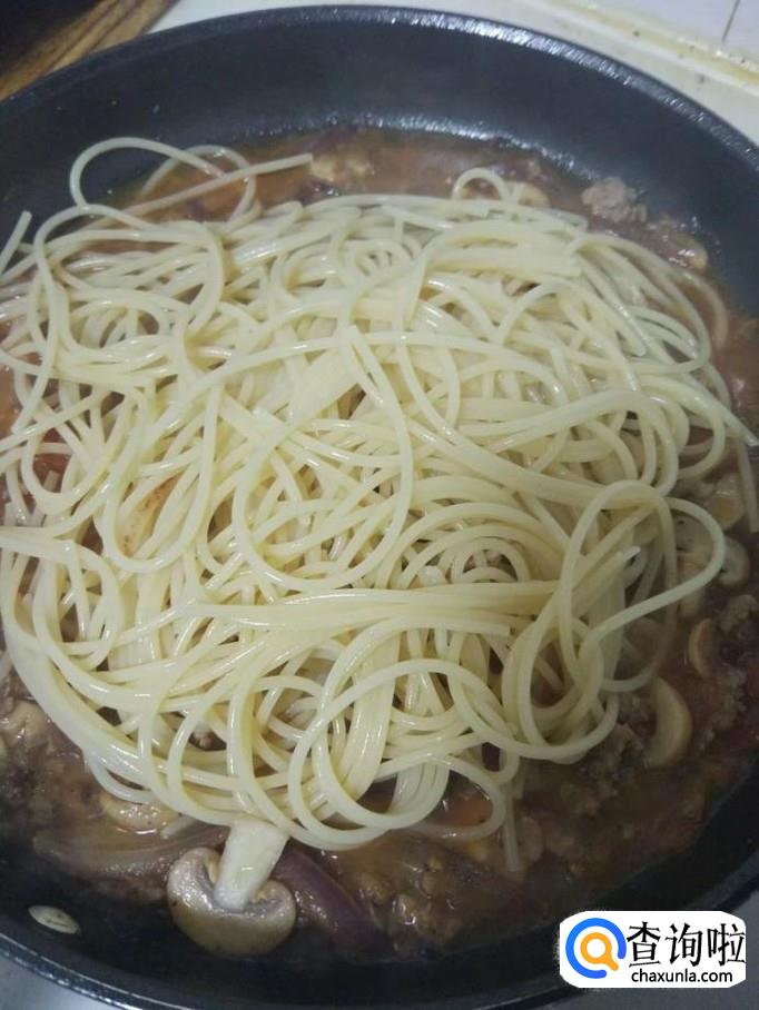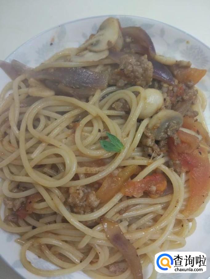肉沫、番茄、洋葱、大蒜、黄油、蘑菇、黑胡椒粉、意大利面