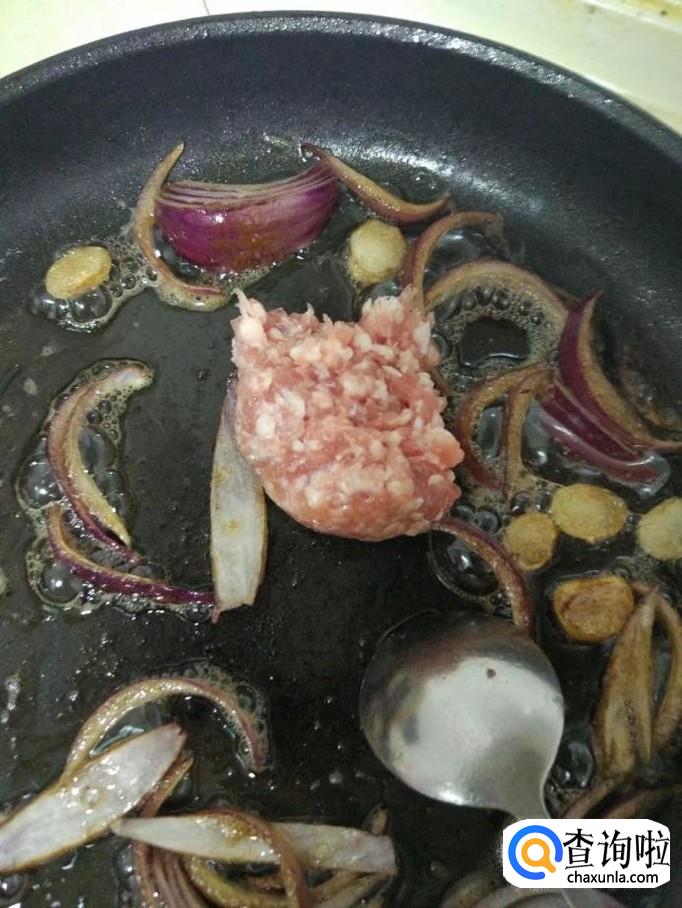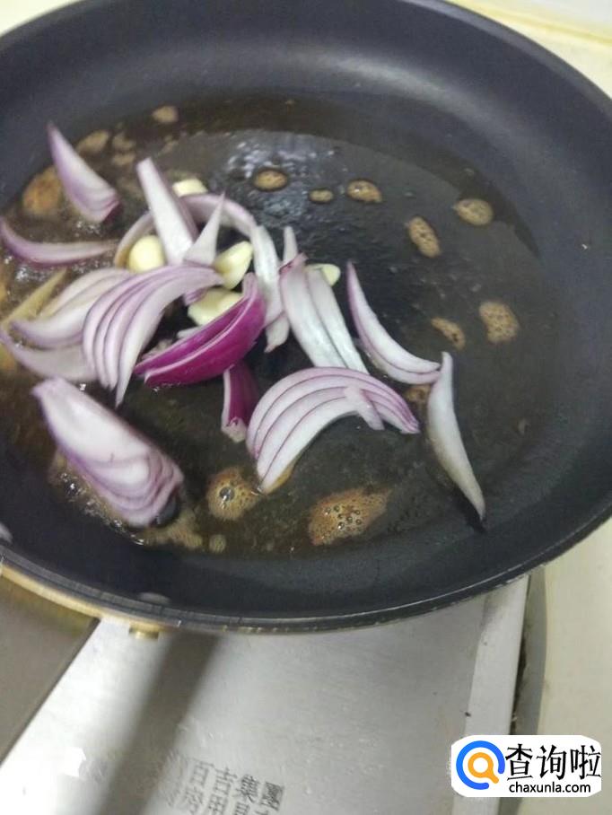 放入准备好的洋葱和大蒜片,直到洋葱变色