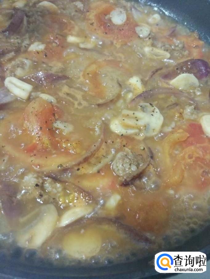 加入准备好的番茄片,然后再加入一碗清水,直到番茄软烂,放入黑胡椒粉和食盐