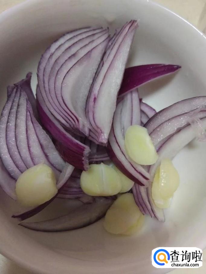 洋葱去皮切丝,大蒜剥皮然后切片,然后一起放在碗内备用