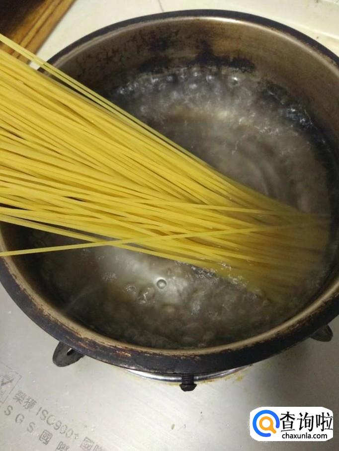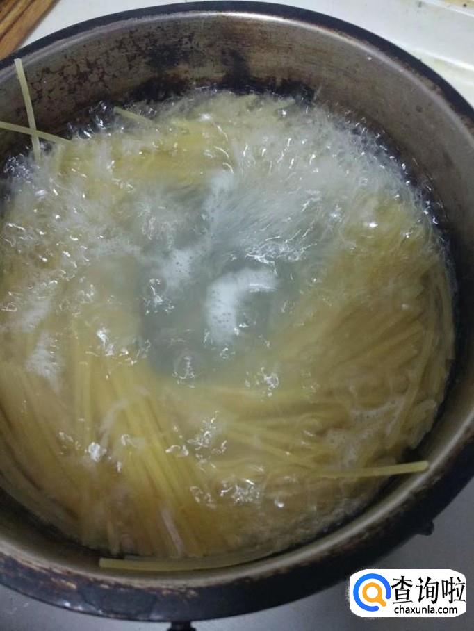 煮一锅清水烧沸后加入意大利面,然后再加入一勺油和一勺食盐,煮8分钟左右
