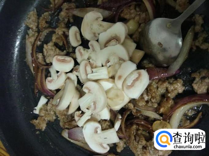 放入肉沫进行翻炒,然后再加入蘑菇片进行翻炒
