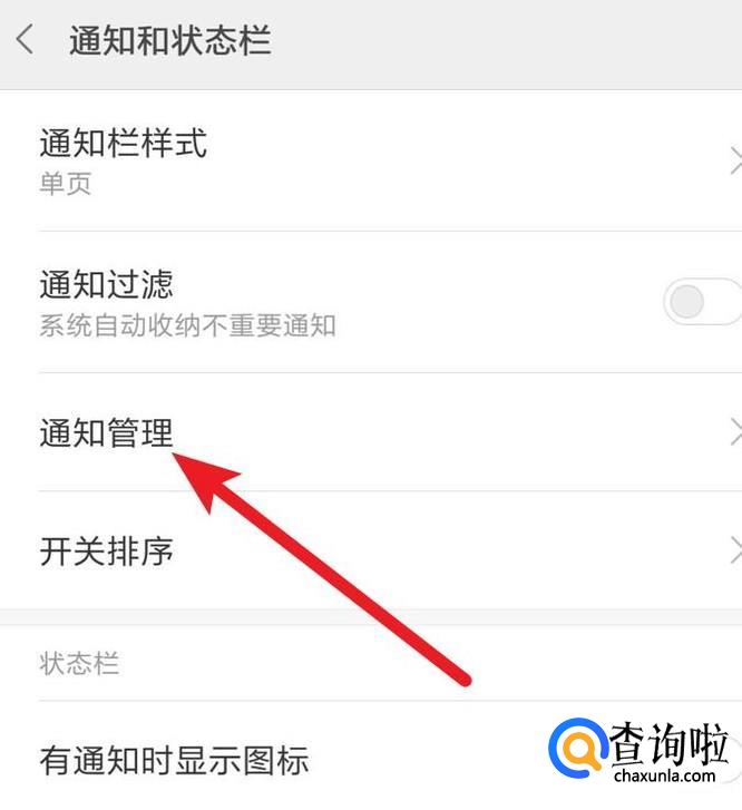 在通知和状态栏设置页面,点击打开‘通知管理’