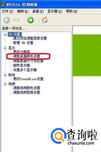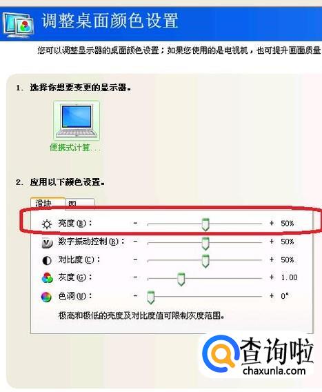 在出现的界面中,点击“调整桌面颜色设置”,就出现多项颜色设置选项,移动图中滑块,就可以调节屏幕亮度了。