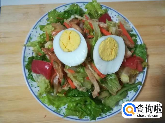 然后把切好的鸡蛋摆放在大拌菜上,这样蔬菜鸡肉营养大拌菜就做好了。