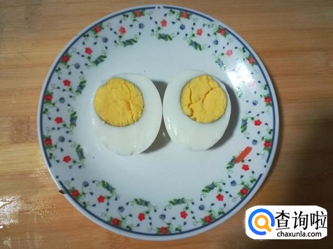 把鸡蛋煮熟去皮,用刀切成两半放盘里。