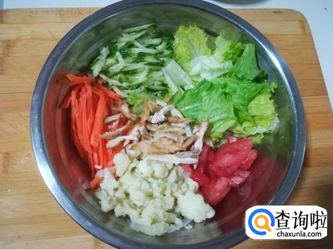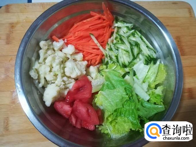 把生菜撕成片,胡萝卜去皮切成丝,菜花掰成小朵,西红柿切成块,黄瓜切成丝全部放入一个调菜盆里。