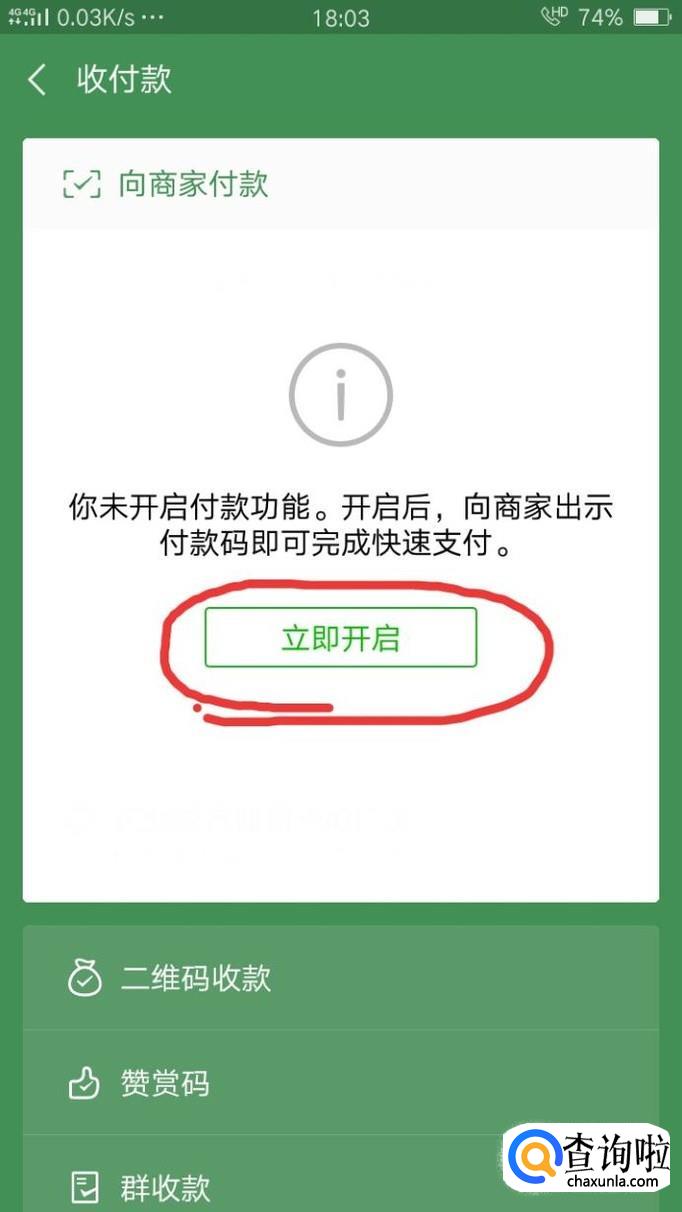 点开后会出现付款码,付款码是用于向商家付款的,首次使用需要点击“立即开启”。