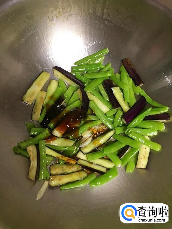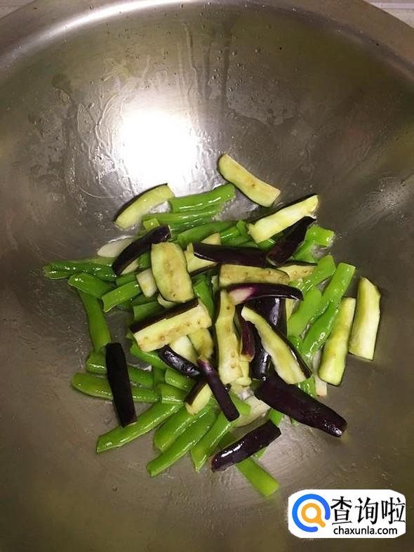当茄条有些出水时,控干其中的水分,这样炒制的时候,茄子就不会吃油了。