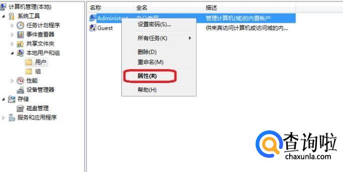 就可以看到管理员账户了,我们右键点击一下,选择“属性”。