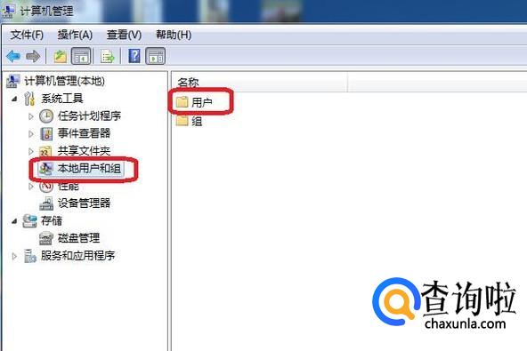 单击左侧栏里的“本地用户和组”,然后双击打开“用户”。