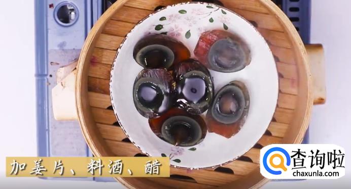 把切好的皮蛋装盘,放入蒸锅里,在盘中加入姜片、料酒和醋,盖上锅盖一起蒸15分钟。