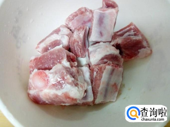 排骨剁成块,放入水中浸泡,去除血水。然后用水清洗干净,控干水分。