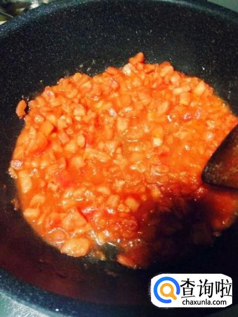 现在要加的就是咱们切好的西红柿丁了,加进去之后就开始翻炒,直到西红柿炒成糊糊状,油变得红彤彤的就可以了。然后根据口味,加入食盐、一点味素调味。