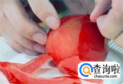 一次火锅汤底大概有两个西红柿就可以了,两个西红柿清洗干净之后,用刀子切一个十字,然后浇上开水,这样能够轻轻松松的剥皮。