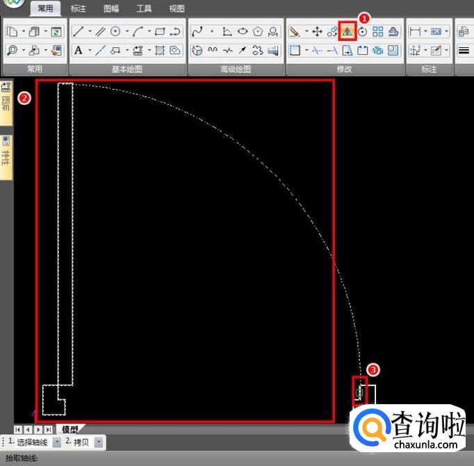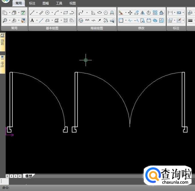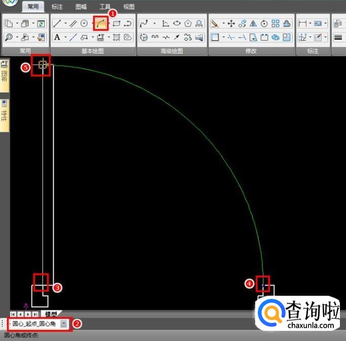 切换图层为细实线层,用于绘制开门轨迹,按照图中点击顺序,以门的左下角为圆心,门框左上角和门的左上角为起点和终点,绘制圆弧,这样单门就画好了;