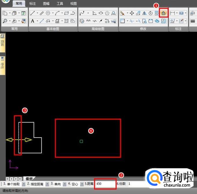 使用等距线功能,以左边长80的直线为基准,距离450mm,做出一条对称轴;