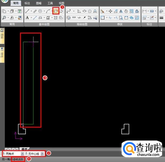 接下来绘制门,使用矩形命令,以门框的右上角顶点为基准,向右上方绘制矩形,输入@40,820的相对坐标作为矩形右上角顶点的坐标,不加@是绝对坐标,会出错;