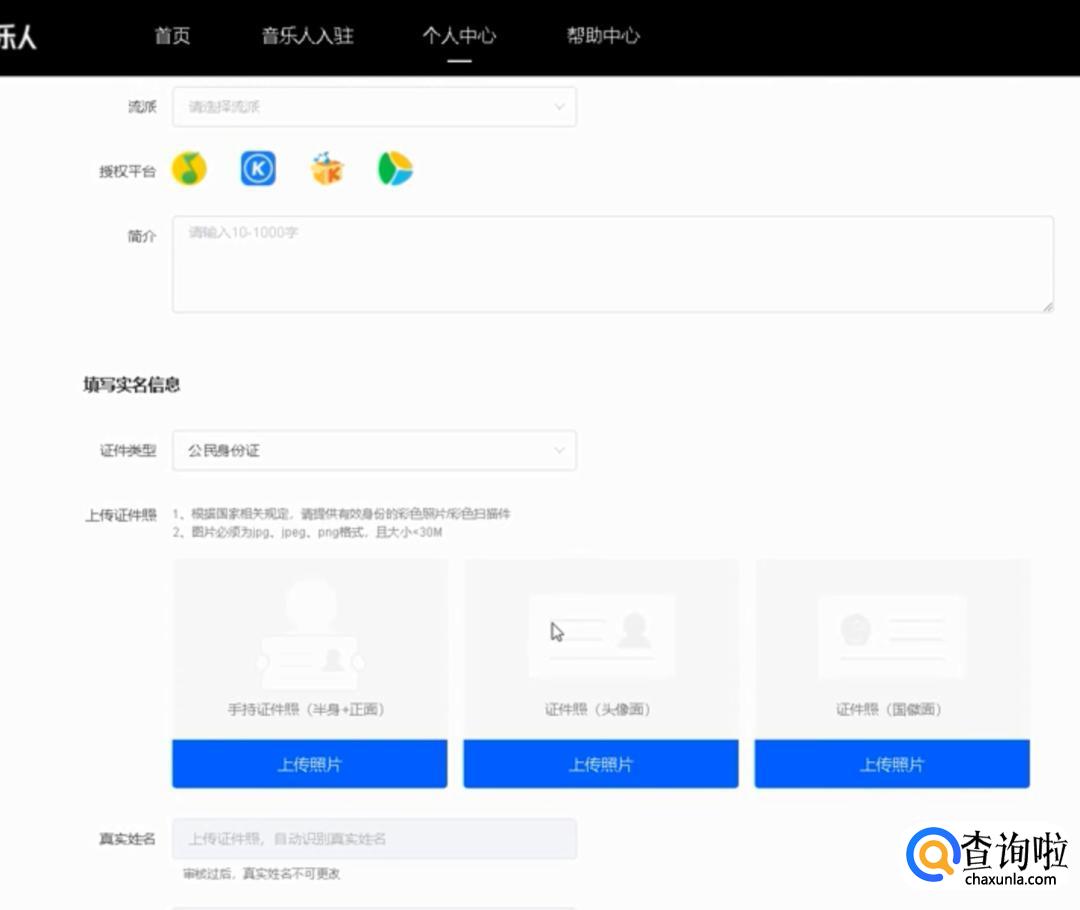 进入界面,选择成为音乐人。进入界面,输入真实姓名,然后创建音乐人,同意以上协议。点击下一步。
