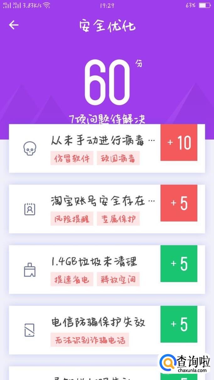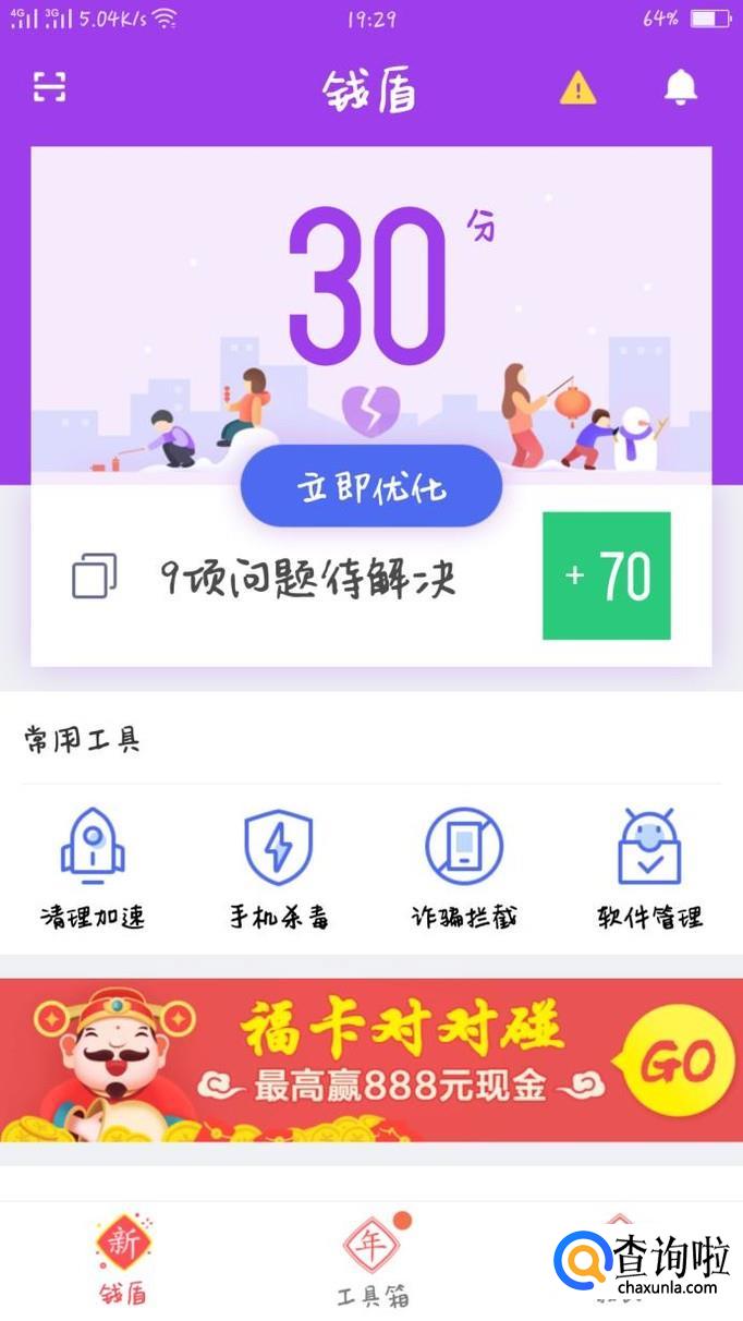 点击左下角的“钱盾”进入安全评分界面,我们会发现一开始的评分是很低的,我们可以进行优化,根据优化的要求来加强,分数就会提高了。