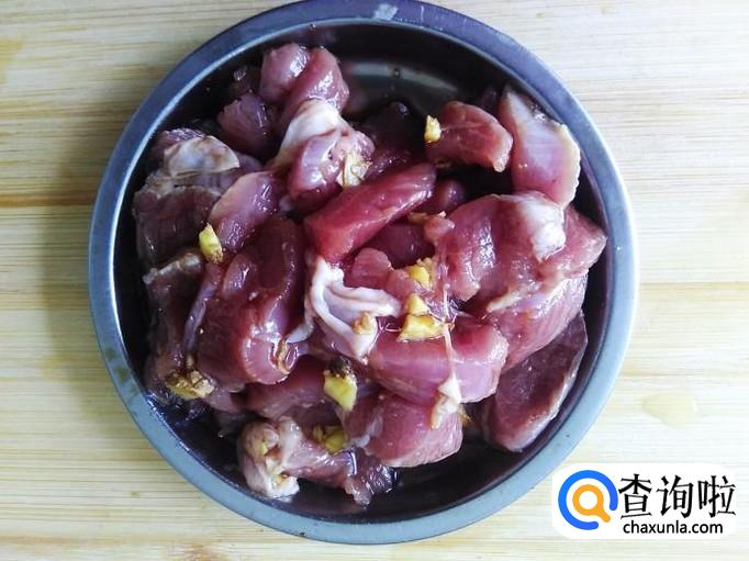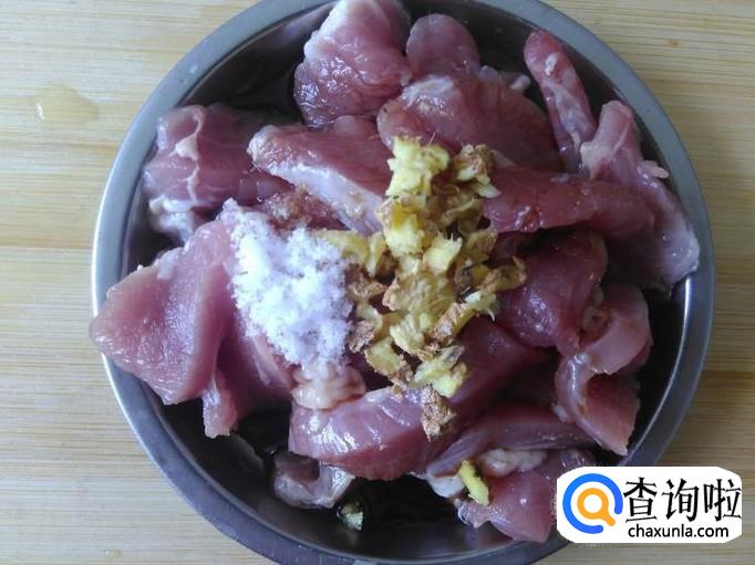 瘦肉切成片,加适量的盐、姜蓉、1勺生抽、1勺料酒腌制几分钟。