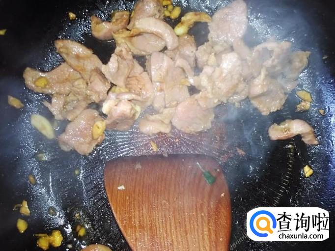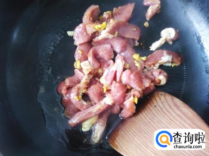 再热锅下油,放蒜米爆香,然后瘦肉下锅翻炒。