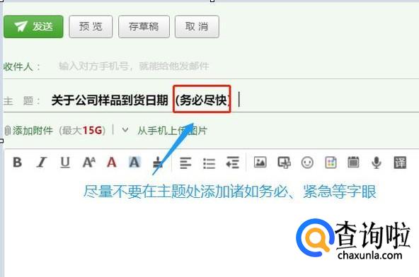 切勿在主题处添加诸如“紧急”“务必”等这样的字眼,当然如果你是领导,你属于布置任务这种情况例外,如果我们是给上级回复邮件,那么加上这些字眼分明就有强制的意味了;