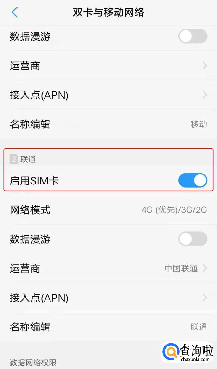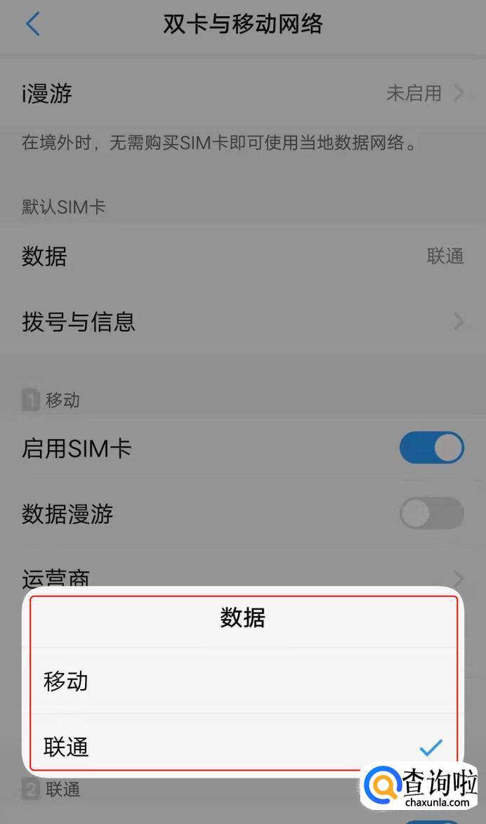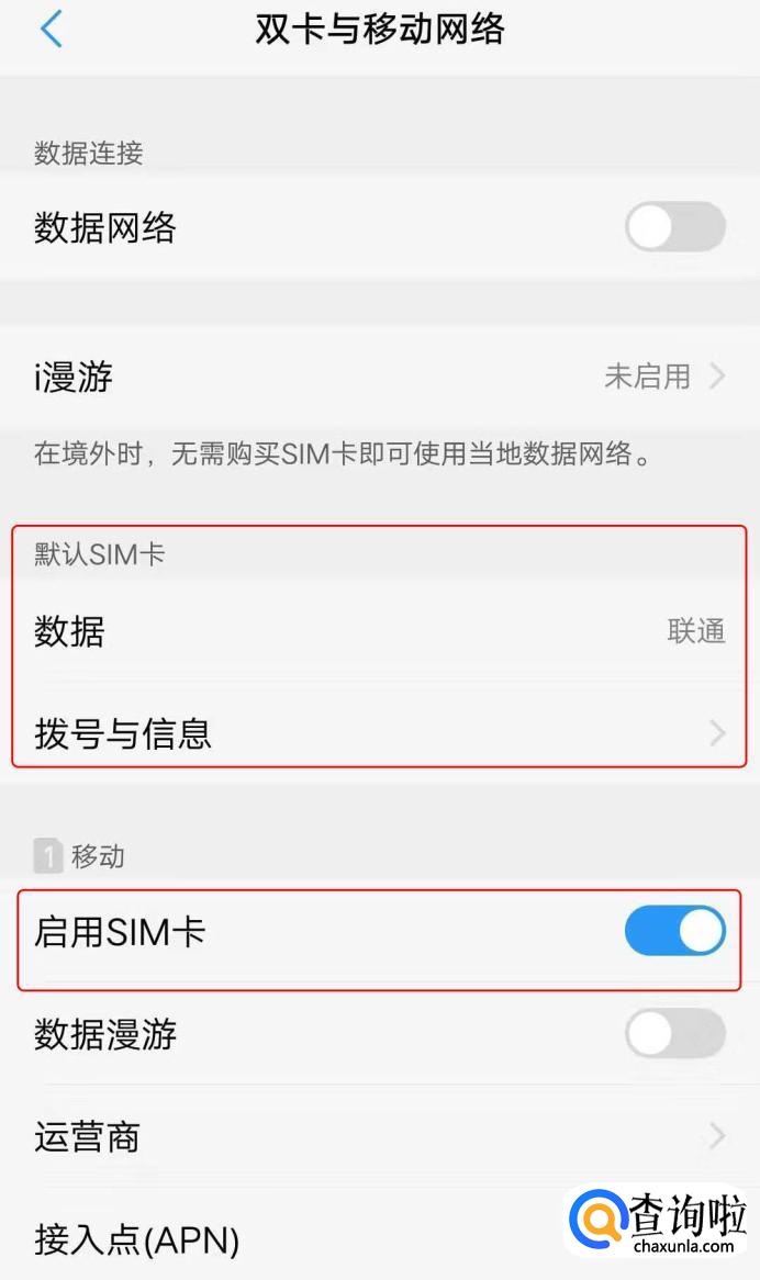 在这里能看到自己的SIM信息,首先要开启SIM的启用,然后再点击“默认SIM卡”项,这就是我们平时上网、打电话用的卡。