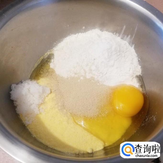 面粉200克,玉米粉,小米粉各50克放入盆中,鸡蛋一个磕入盆中,放入白糖20克,盐2克,酵母3克,橄榄油10克。