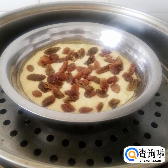 将面糊倒入不锈钢盆中,轻轻震动出气泡,撒上葡萄干,蒸锅中放入凉水,放上面糊,盖上盖中火烧开。